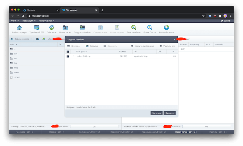 Теперь нужно загрузить zTDS на хостинг. Скачиваете zip архив вот тут и загружаете его на хостинг (кнопка «Загрузить файлы»):