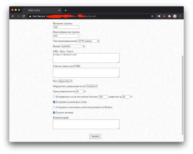 Называем её как угодно в поле «Название группы», в поле «Идентификатор группы» вводим то, что будем поставлять к ссылке на tds. В «URL / Код / Текст» указываем ссылку, куда льём трафик. Остальные поля по необходимости, мы заполнили только необходимый минимум для первого теста работы tds.